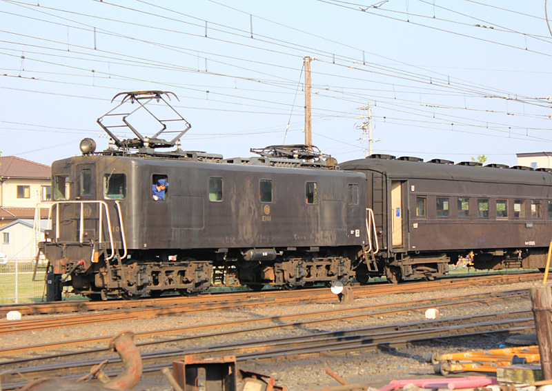 そんな大井川鐡道は電気機関車も所有しており、その中からE101を取り上げます。 E10形は、1949年(昭和24年)の大井川本線電化に際して、E101とE102を三菱重工で、 E103を日立製作所で製造されました。B-B軸配置、自重45tの箱型電気機関車です。 当初は、大井川本線の貨物輸送に従事し、 1976年(昭和51年)SL急行列車運転開始後補機として運用されていました。 1983年(昭和58年)貨物輸送が廃止されると、 ED500形と共にSL急行列車の補機やビール列車などのイベント時の臨時客車列車の牽引や、 新金谷車両区での客車の入換作業が主運用となり、現在に至っています。