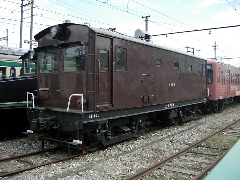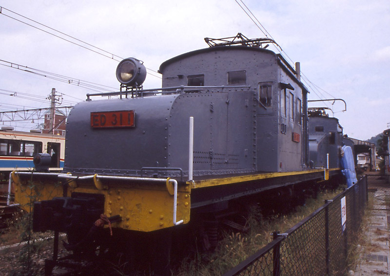 さて、そのような会社で保存をされている「ED311」は、 1923年(大正12年)に車体と機械部分を石川島造船所、電気機器を芝浦製作所が造り、 伊那電気鉄道(飯田線)に納入された「デキ1形デキ1」です。 これもの黎明期の国産電気機関車で博物館で展示すべきものといえます。 同社は1943年(昭和18年)国鉄に戦時買収されましたが引き続き飯田線で使用され、 1952年(昭和27年)形式改称で「ED31形」となりました。 世の中が戦後の混乱から抜け出ると買収された車両の廃車が始まります。 「ED311」も1955年(昭和30年)に廃車となり僚機「ED312」とともに西武鉄道へ譲渡され、 さらに1960年(昭和35年)に近江鉄道へ再譲渡されます。 国鉄から直接譲渡の「ED313」「ED314」「ED315」とともに本線で貨物列車の主力として活躍しました。 運用がなくなってからは彦根工場内で保管され、2004年(平成16年)除籍されました。