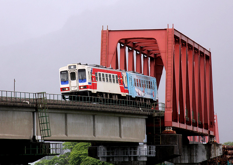 一目で「三陸鉄道の車両」と分かる列車が、大渡川橋梁(釜石〜平田)を渡っているところです。 先頭が36-207、後ろが36-101。 |