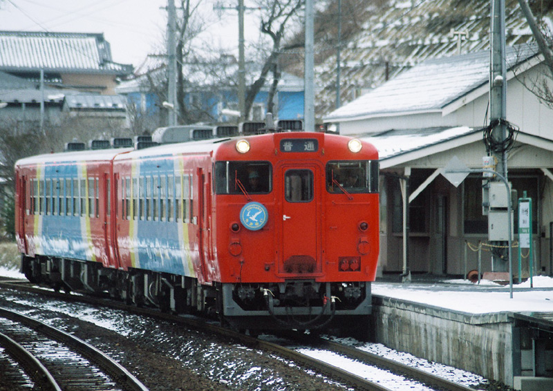 2008年には、八戸線で、まだキハ48 555+1549「うみねこ」が走っていました。 この車両、ジョイフルトレインにもかかわらず最後まで非冷房でした。 2008年1月11日 階上(はしがみえき)駅