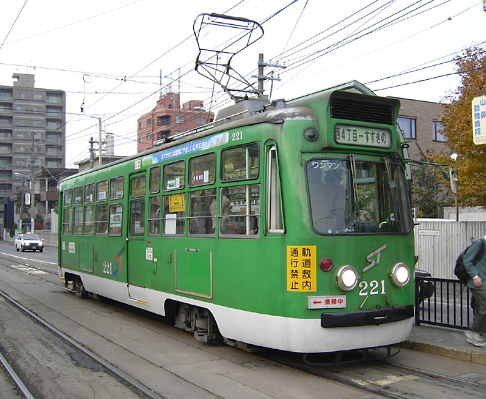 220形「221」は丸味を帯びた形で北海道の泰和車両が1958年(昭和34年)製造という両方の特徴を持った車両です。 前年に製造された210形と同一ですが、製造年度の違いから別形式となりラッキーなトップナンバーとなっています。 220形は8両製造されましたが既に6両が廃車され、現在は「221」「222」のみ頑張っています。 しかし、直接制御から間接非自動制御に改造され車体も2度更新されていますので、 まだまだ活躍すると思っています。 (2010年8月 T・O)