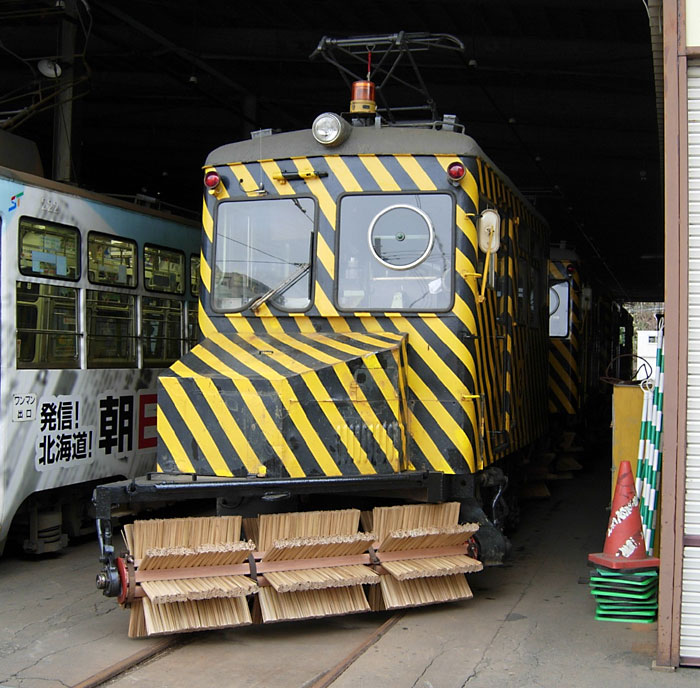 札幌を訪れたのは11月15日でしたが、札幌市電名物のササラ電車(除雪車)は いつでも出動できるように準備が整っていました。 ちなみにこの年の第一回目は翌週だったそうです。 2008年11月15日 電車事業所:許可を得て撮影