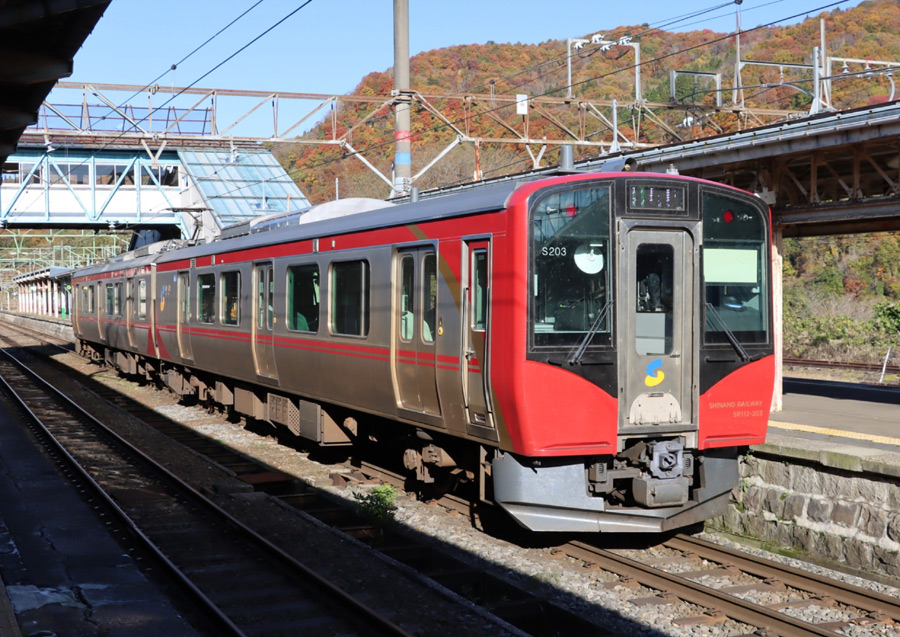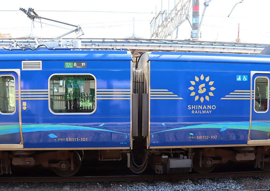 北陸新幹線 (暫定措置として長野新幹線と表記されました) が1997年(平成9年)長野まで開業すると、 並行在来線である信越本線軽井沢〜篠ノ井間は第三セクターのしなの鉄道へ引き継がれました。 その時に、115系と169系がJR東日本から譲渡されて115系は、JR東日本の長野駅までの乗り入れを含め、 全線で運用されました。一方の169系は、 戸倉〜軽井沢間の運用と朝の小諸→長野の有料列車「しなのサンライナー」として運転されました。 その後、「しなのサンライズ号」へ改称されて、 夕方の時間帯に長野→上田の「しなのサンセット号」が追加されています。 しかし、運転状況記録装置、EB装置を搭載するように省令が出され、 115系は運転席がある全車両に搭載工事が施工されましたが、 169系は車齢が高く機器の搭載工事は見送られました。 その結果JR東日本の篠ノ井〜長野間に乗り入れることができなくなり、 「しなのサンライズ号」と「しなのサンセット号」は、JR東日本の189系に交代をしました。 その189系も引退をして、その後は115系が快速として運転されていました。 しかし、その115系も製造後40年が経ち、老朽化が目立ち始めました。 さらには、時代の流れで省エネ化推進が求められ、 また朝夕のライナーを再び有料化することで増収が期待されることから、 ライナー車両の投入が検討され、2020年(令和2年)誕生したのがしなの鉄道初の新製車両 SR1系で、 今回トップナンバーとして取り上げた「しなのサンライズ号」・「しなのサンライズ号」 と軽食付き「軽井沢リゾート号」用のクモハSR111形+クモハSR112形の100番台車です。 翌年の2021年には、一般車両の200番台も製造されています。