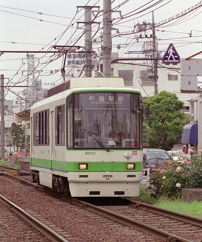 さて、8500形は平成2年(1990)に28年ぶりの新車として登場、 平成4年と5年に2両づつ増備され総勢5両の所帯です。 窓を大きくとり軽快なデザインにカルダン駆動、VVVF制御、 単行にもかかわらず電気指令ブレーキが採用されています。 荒川線はホームを高くしたのでステップがないデザインは路面電車としては異色ですね。