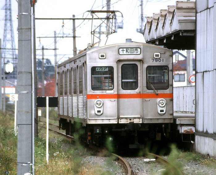 十和田市寄りのクハ7901(東急:クハ7904←デハ7047) 東急時代と比較すると列車アンテナが十和田観光電鉄用に変更されていたり、貫通路 の渡り板が撤去されていたりしていますが、大掛かりな改造はされていません。 (2005年10月30日 十和田市駅) |