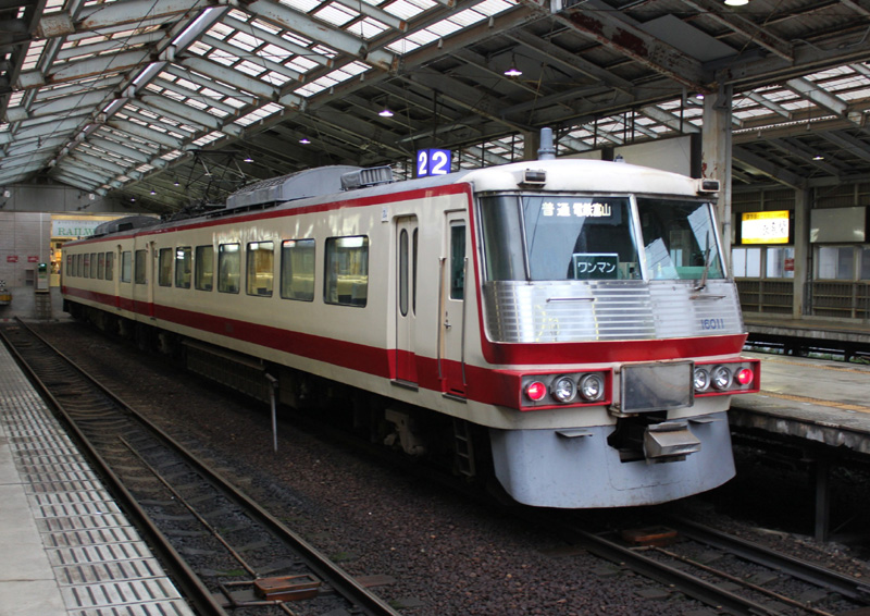 普通列車として、電鉄富山駅に到着したモハ16011+モハ16012のトップナンバー編成。 |
