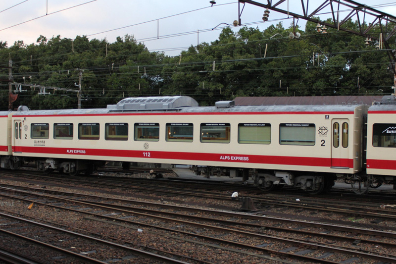 第2編成のモハ16014+クハ112+モハ16013です。 観光列車「アルプスエクスプレス」専用車両となり、 1号車のモハ16014には、トイレが設置されました。 設置場所は、クハ112の連結寄りの窓がない部分で西武時代は車販準備室でした。 2015年11月15日 稲荷町テクニカルセンター