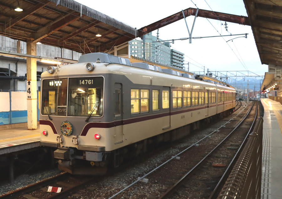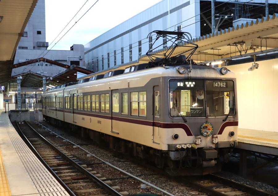 電鉄立山から「特急」として電鉄富山に到着。 折返し、「普通」宇奈月温泉行となったモハ14761+モハ14762です。 なお、電鉄富山駅は、高架工事が始まり、改札口やホームが変更されていました。 |